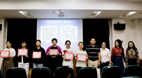 首先,图书馆副馆长夏武祥为获得2018年度十佳优秀读者荣誉的学生颁发奖状及奖品,对获奖者表示祝贺,并鼓励其他同学继续努力,与获奖者合影留念。颁奖后,夏老师向读书指导员重点推介了图书馆博学易知、起点考试平台数据库,希望大家都能学习使用,并介绍给更多的同学。