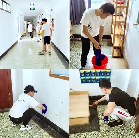 中午12点,活动正式开始,各小组长领取水桶、抹布、刷子、洗衣粉等清洁工具,分散打扫。扫地、拖地、刷墙角,擦污垢,一步接一步,分工明确,细致到位。明明是铁血的汉子,却也有细腻的情怀。一遍遍的打扫,汗水湿透衣背,试问是否很累,却道奉献无悔。