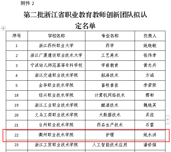 近日,浙江省教育厅公布了第二批浙江省职业教育教师创新团队名单,以我校副校长姚水洪教授为团队负责人的护理专业教师创新团队获批立项。